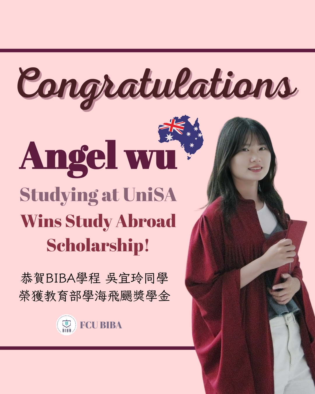 Congratulations to BIBA Program student Angel Wu on receiving the MOE Study Abroad Scholarship (Shih Hai Fei Yang Award)!